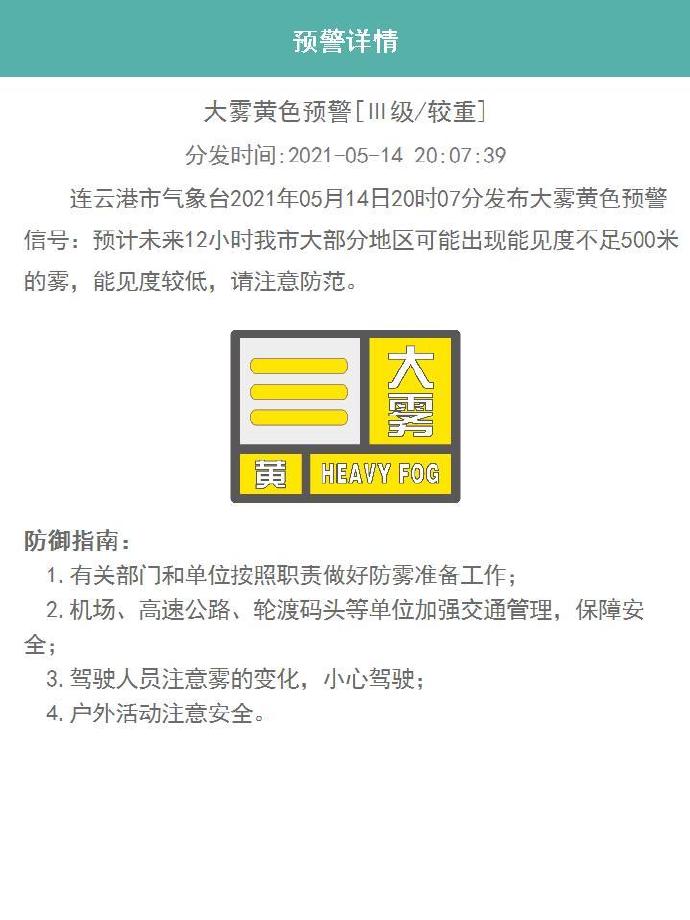 江苏省连云港市气象台2021年05月14日20时07分发布大雾黄色预警信号:预计未来12小时我市大部分地区可能出现能见度不足500米的雾,能见度较低,请注意防范。