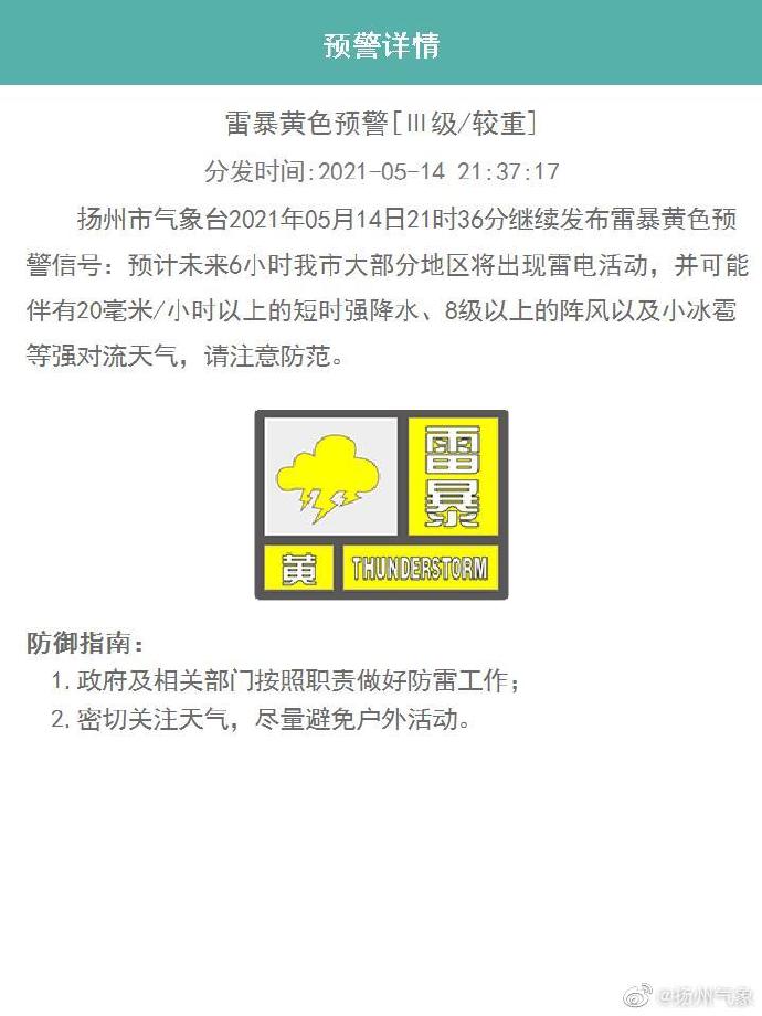 江苏省扬州市气象台2021年05月14日21时36分继续发布雷暴黄色预警信号:预计未来6小时我市大部分地区将出现雷电活动,并可能伴有20毫米/小时以上的短时强降水、8级以上的阵风以及小冰雹等强对流天气,请注意防范。