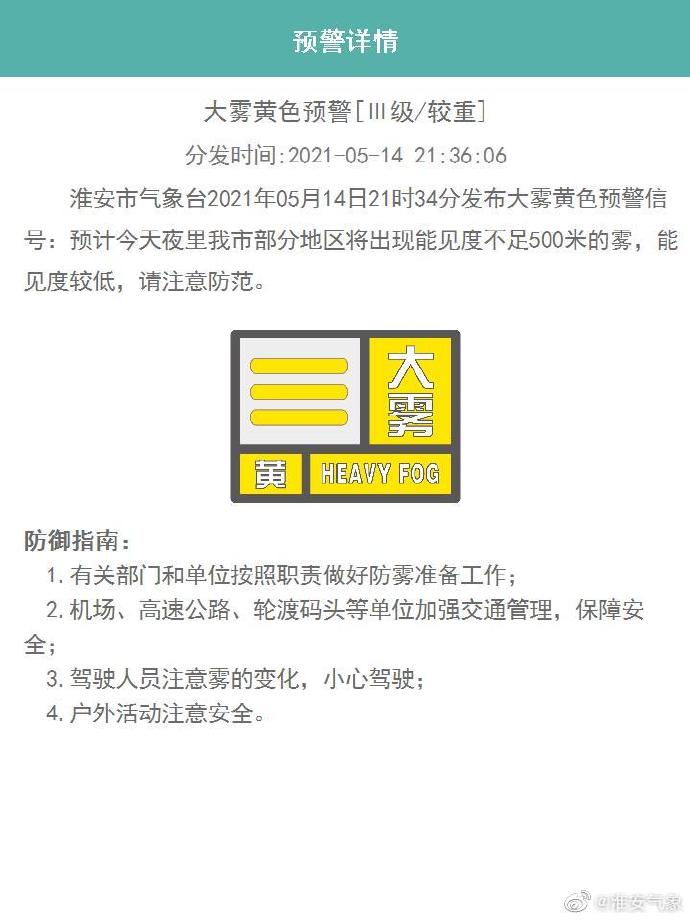 江苏省淮安市气象台2021年05月14日21时34分发布大雾黄色预警信号:预计今天夜里我市部分地区将出现能见度不足500米的雾,能见度较低,请注意防范。