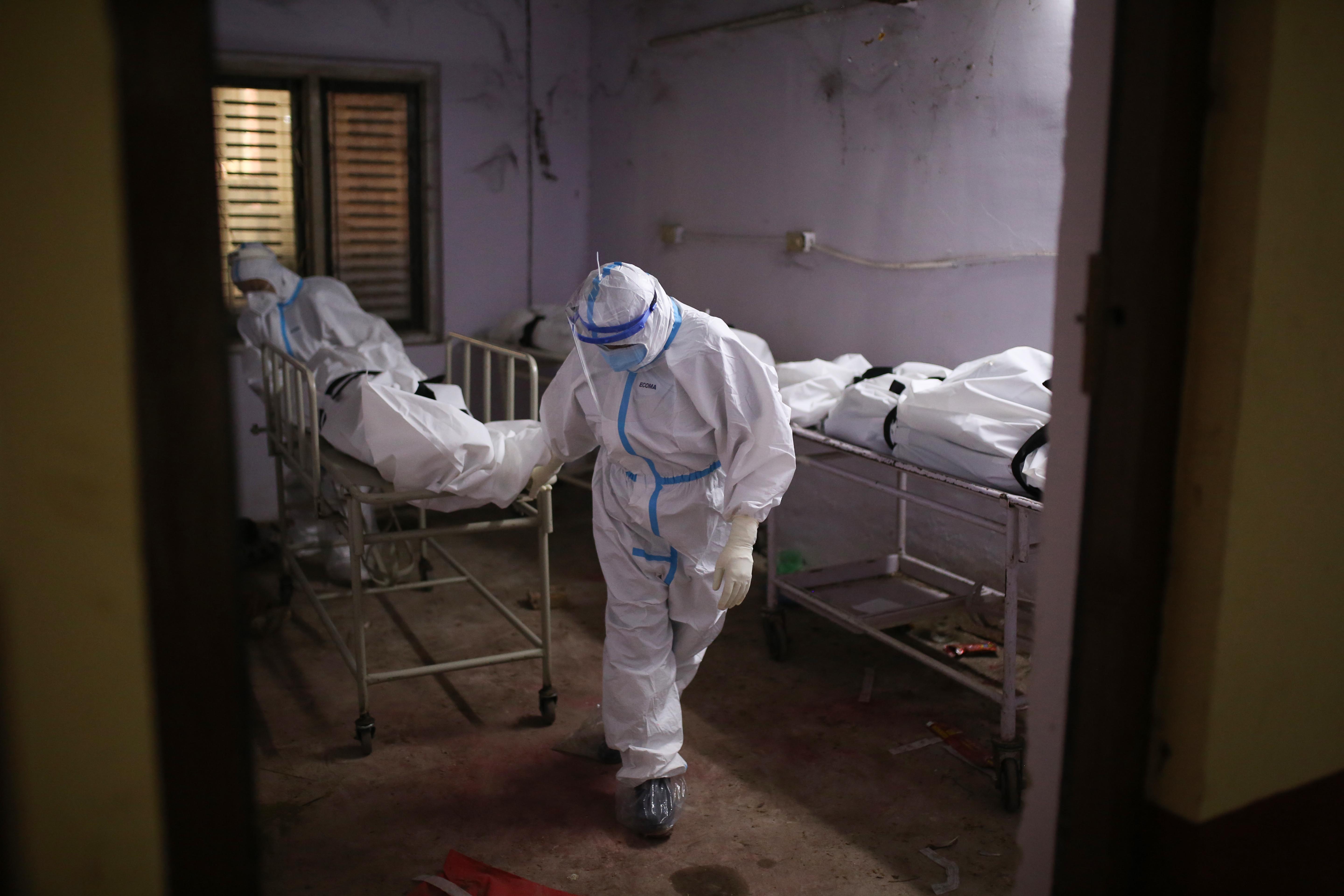 5月12日,医务人员在尼泊尔加德满都的一所医院搬运新冠患者的遗体。新华社发(苏拉韦·什雷斯塔摄)