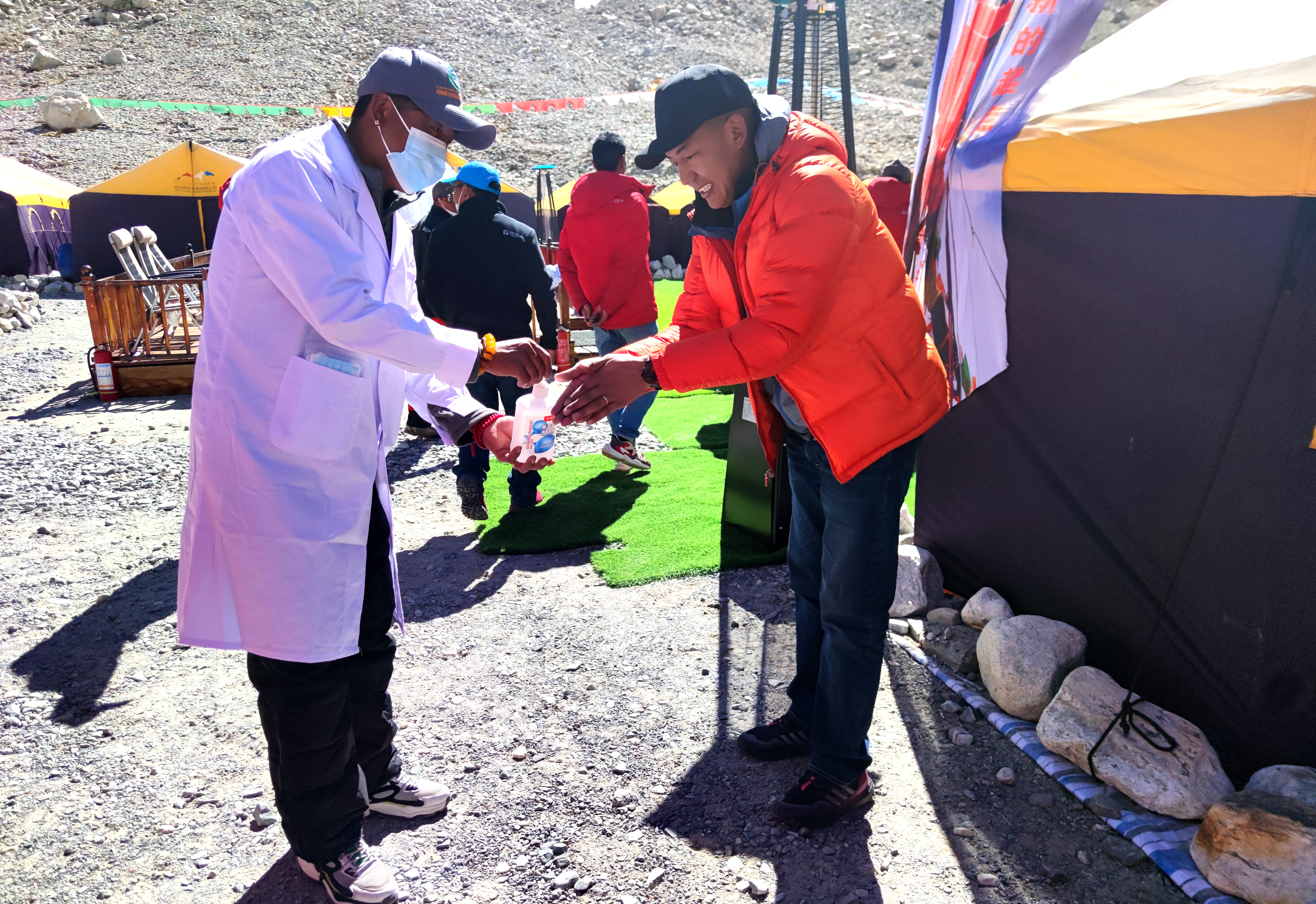 5月9日,医生为进入大本营的西藏登协工作人员进行手部消毒(手机拍摄)。新华社记者 王沁鸥 摄