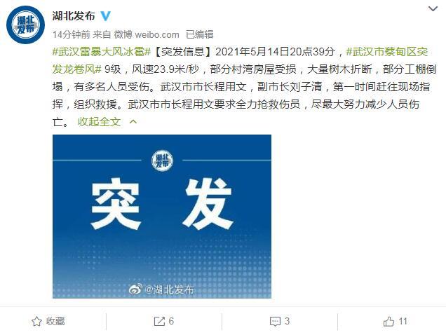 中新网5月14日电 据湖北省人民政府新闻办公室官方微博消息,5月14日20点39分,武汉市蔡甸区突发9级龙卷风,风速23.9米/秒,部分村湾房屋受损,大量树木折断,部分工棚倒塌,有多名人员受伤。武汉市市长程用文,副市长刘子清,第一时间赶往现场指挥,组织救援。武汉市市长程用文要求全力抢救伤员,尽最大努力减少人员伤亡。