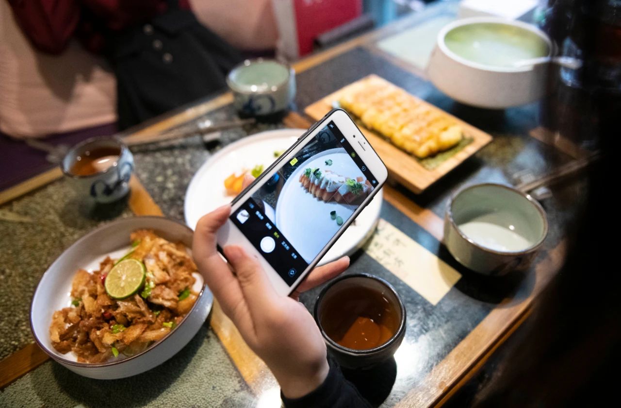 6月14日,在昆明市一家素食餐厅,顾客给菜品拍照。新华社发(陈欣波 摄)
