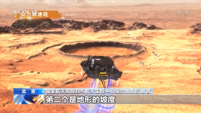 国家航天局探月与航天工程中心深空部部长 耿言:第一个方面是它希望着陆区的海拔尽可能低,这样使我们着陆过程的时间可以稍微更长一点,使得它的过程更从容一些。第二个是地形的坡度,因为如果太陡峭的话,这个下去探测器的姿态就不好控制,一个有可能会翻,再有一个如果太陡峭的话,通信不太容易建立。