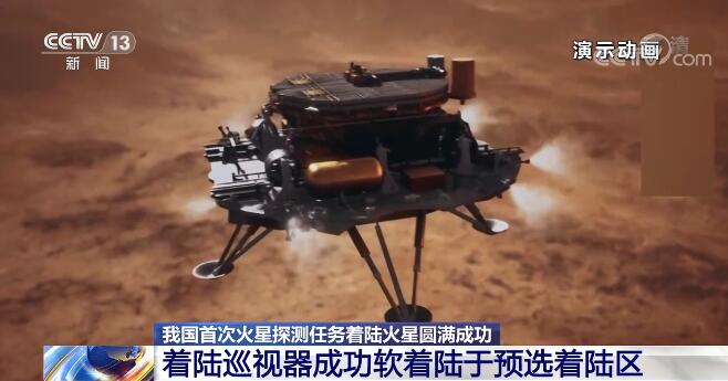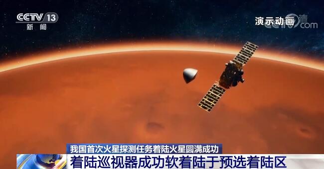 凌晨1时许,天问一号探测器在停泊轨道实施降轨,机动至火星进入轨道。4时许,着陆巡视器与环绕器分离,历经约3小时飞行后进入火星大气,经过约9分钟的减速、悬停避障和缓冲,成功软着陆于预选着陆区。两器分离约30分钟后,环绕器进行升轨,返回停泊轨道,为着陆巡视器提供中继通信。
