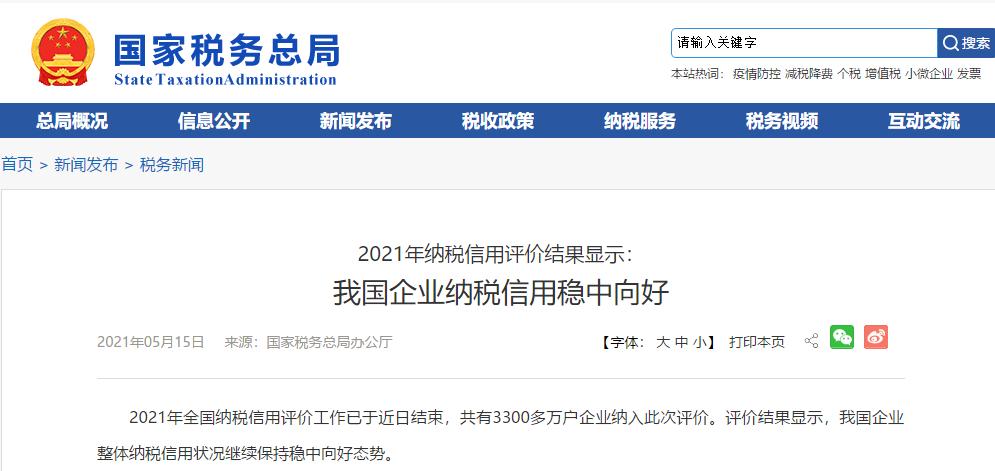 据国家税务总局官网消息,2021年全国纳税信用评价工作已于近日结束,共有3300多万户企业纳入此次评价。评价结果显示,我国企业整体纳税信用状况继续保持稳中向好态势。