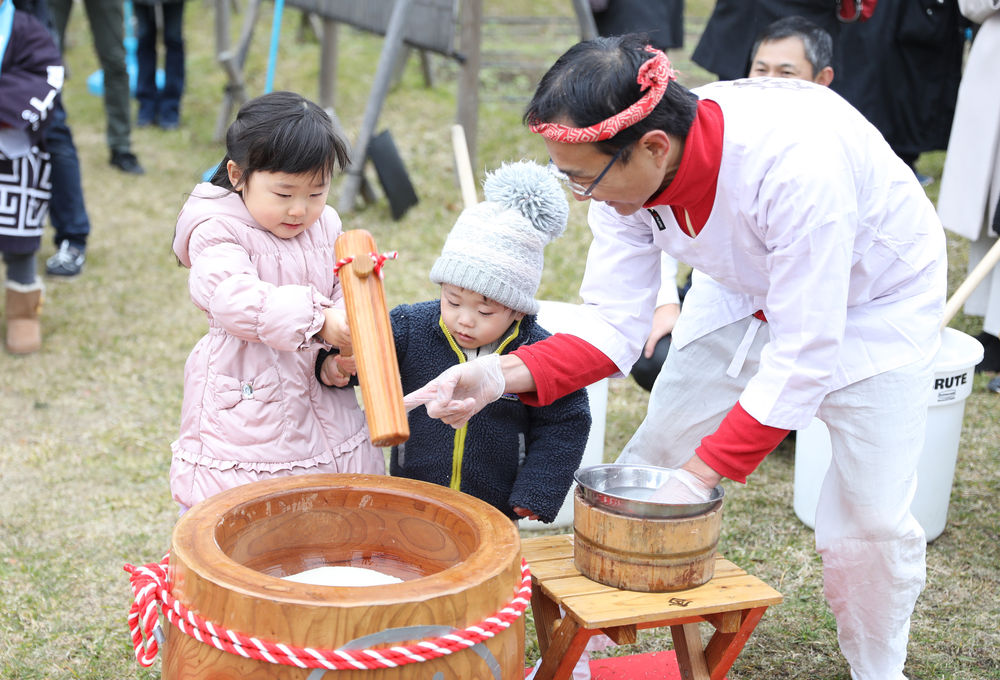 2019年1月12日,在日本东京,两名儿童在一场活动上学习捣年糕。(新华社记者杜潇逸摄)