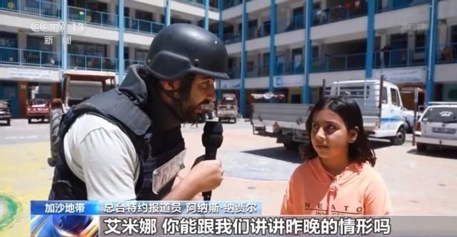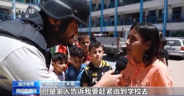 总台特约报道员 阿纳斯·纳贾尔:我们现在所在的位置是一所学校,这里被改造成了一处难民安置所。我身边的这个小女孩名叫艾米娜,她昨天(13日)亲眼目睹了空袭把她的家整个炸毁的过程。