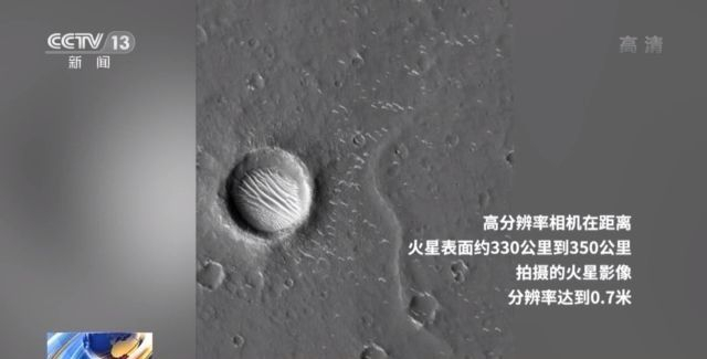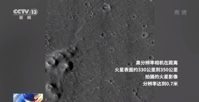 其中两张黑白图像就是高分辨率相机在距离火星表面约330公里到350公里拍摄的,分辨率达到0.7米,这也是我国获取的清晰度最高的火星影像。