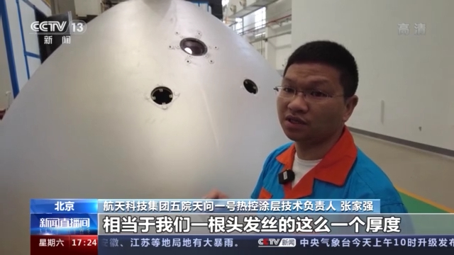航天科技集团五院天问一号热控涂层技术负责人 张家强:我们天问一号的热控涂层,它的厚度大概在0.06~0.08毫米这个范围,相当于我们一根头发丝的这么一个厚度,它主要的目标一个是控制进入天问一号的太阳辐射的热流,另外一部分就是把这部分热流通过红外辐射的方式散出去,同时把内部的一些工作载荷产生的热散出去。