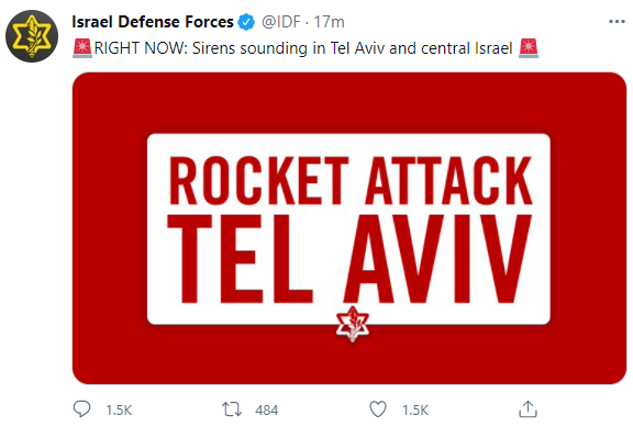 以色列国防部在同一时间在其社交账号上发布消息称,特拉维夫及以色列中部响起防空警报。