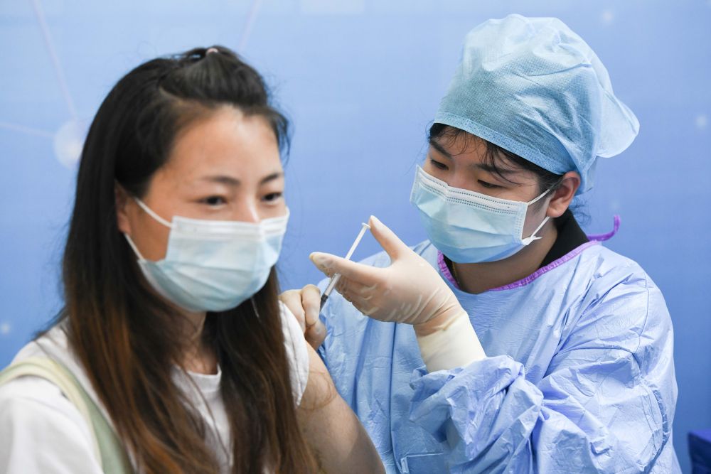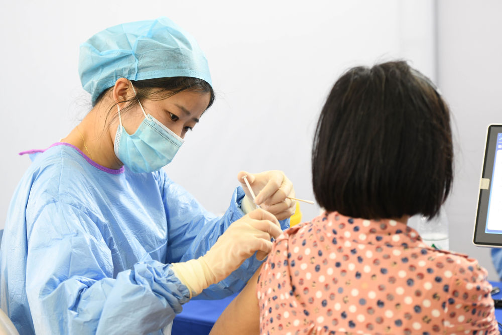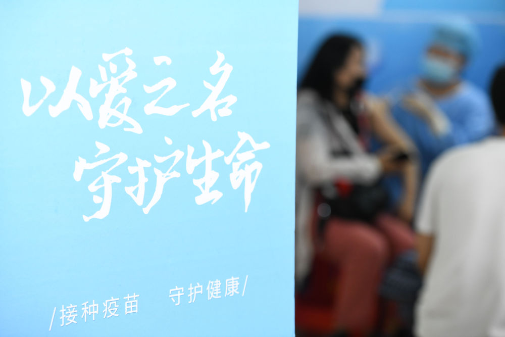 ↑5月15日,在合肥市蜀山区奥体中心方舱接种点,市民在接种新冠疫苗。