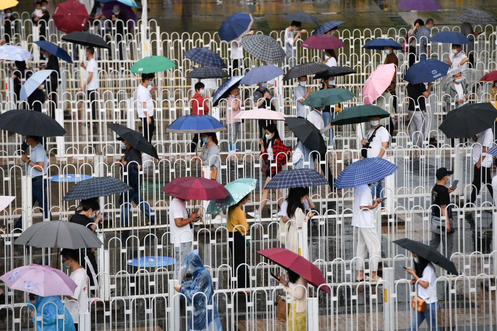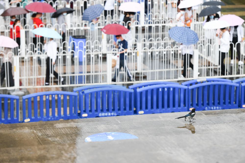 ↑5月15日,在合肥市蜀山区奥体中心方舱接种点,市民排队等待接种新冠疫苗。