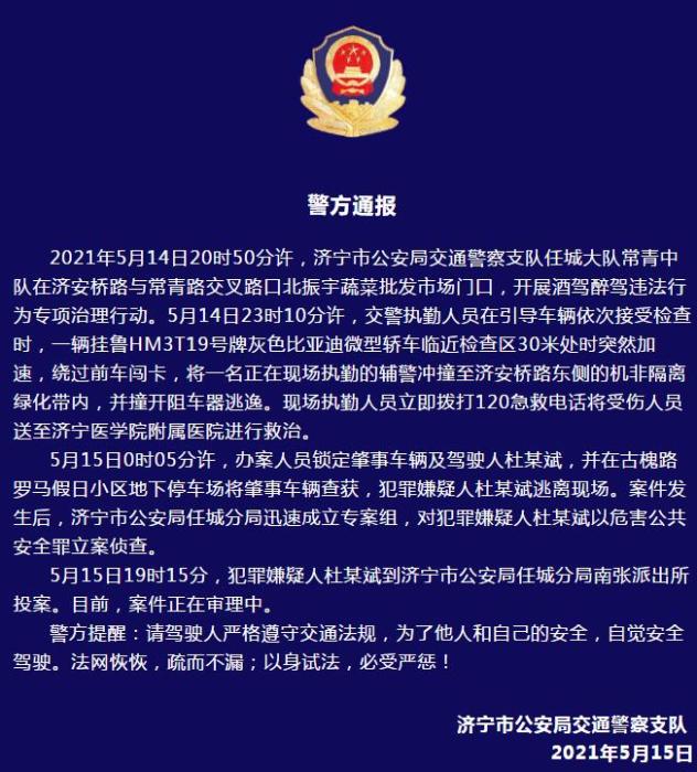 通报称,2021年5月14日20时50分许,济宁市公安局交通警察支队任城大队常青中队在济安桥路与常青路交叉路口北振宇蔬菜批发市场门口,开展酒驾醉驾违法行为专项治理行动。5月14日23时10分许,交警执勤人员在引导车辆依次接受检查时,一辆挂鲁HM3T19号牌灰色比亚迪微型轿车临近检查区30米处时突然加速,绕过前车闯卡,将一名正在现场执勤的辅警冲撞至济安桥路东侧的机非隔离绿化带内,并撞开阻车器逃逸。现场执勤人员立即拨打120急救电话将受伤人员送至济宁医学院附属医院进行救治。