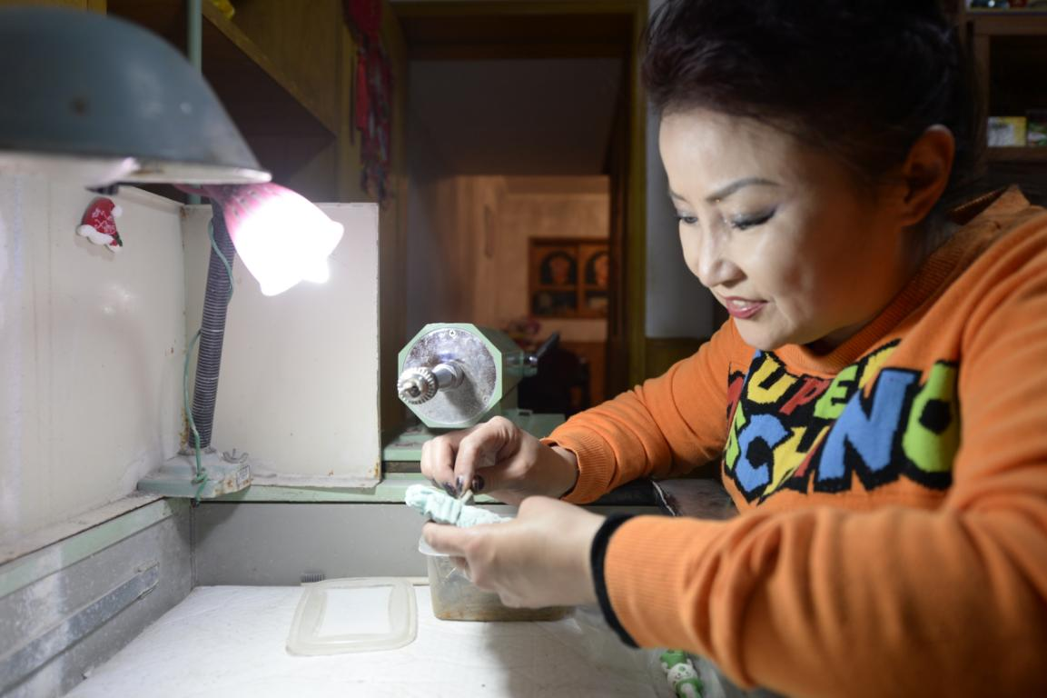 董京莉在家中进行传统玉石雕刻(央视网记者王伟 摄)