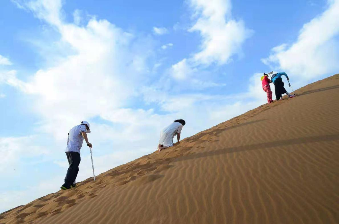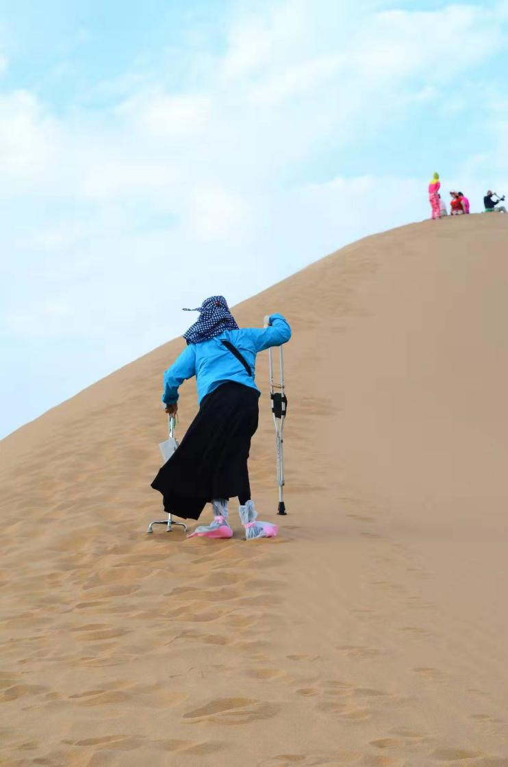 途经一座巨大沙丘时,有人提议大家一起上去看夕阳。沙丘垂直高度相当于四层楼的高度,但是坡面缓长,沙土松软。完全无法行走的人被家属和志愿者一个一个背上去,其他人有的是被搀扶着上去,有的则跪在地上用自己的方式不顾一切地往上爬。