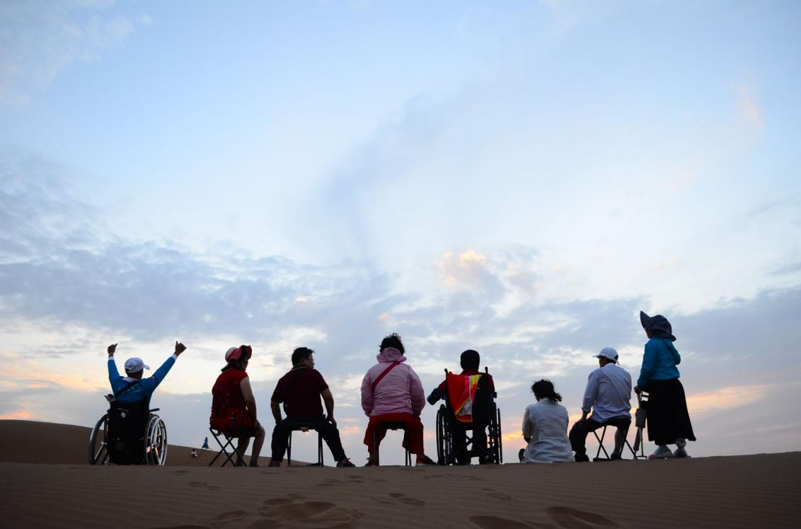 在腾格里沙漠的沙丘上,张仲与一群行走不便甚至从没出过远门的朋友坐在山顶,静待落日余晖。他心情复杂,几度流泪。那天,一位高位截瘫的老大哥抱着他埋头痛哭。