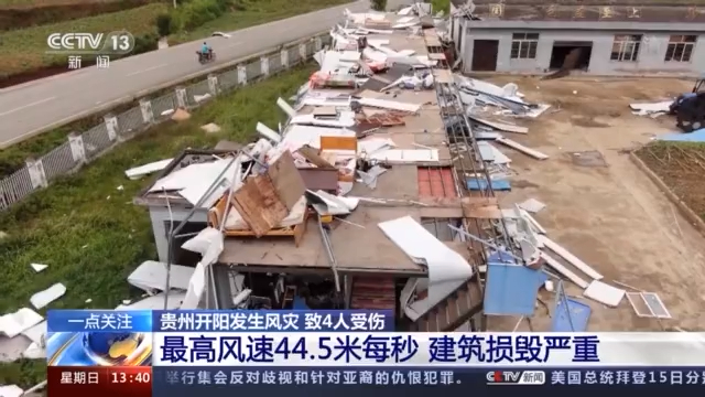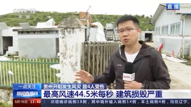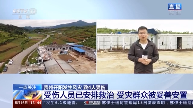 总台记者 史超杰:这一次的风灾造成了多个乡镇共有4名村民出现了不同程度的受伤,他们连夜被送到了开阳县城的两家医院进行救治。风灾还造成了多处民房被摧毁或者受损,有一户民房完全倒塌,数百户民房出现了不同程度的受损。现在这些村民被转移到了村委会、学校等地方临时进行安置。当地政府紧急调运了救灾帐篷、棉被、饮用水和方便面等一些应急物资来保障基本生活。