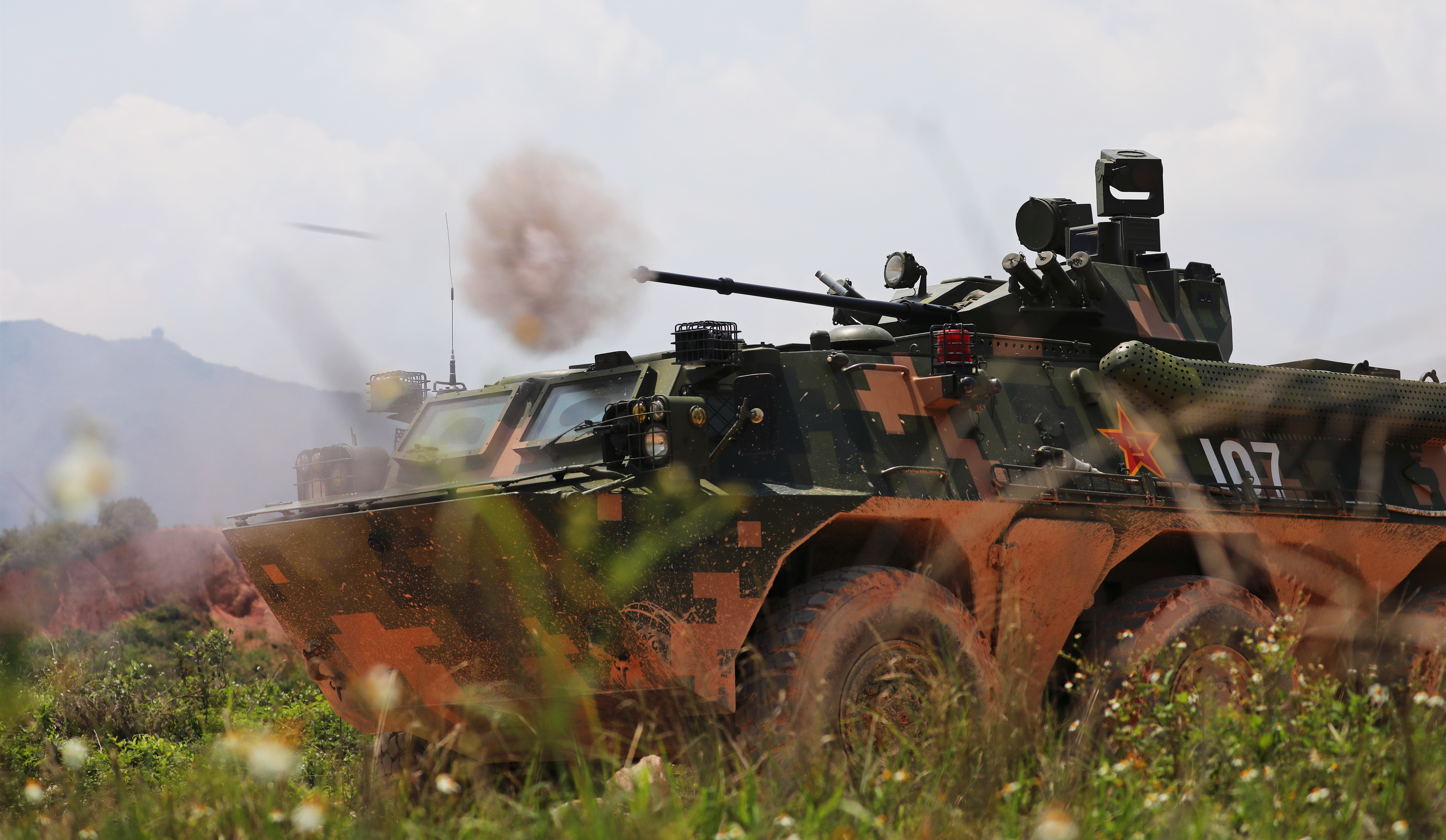 突击车行进间短停射击。方钊 摄
