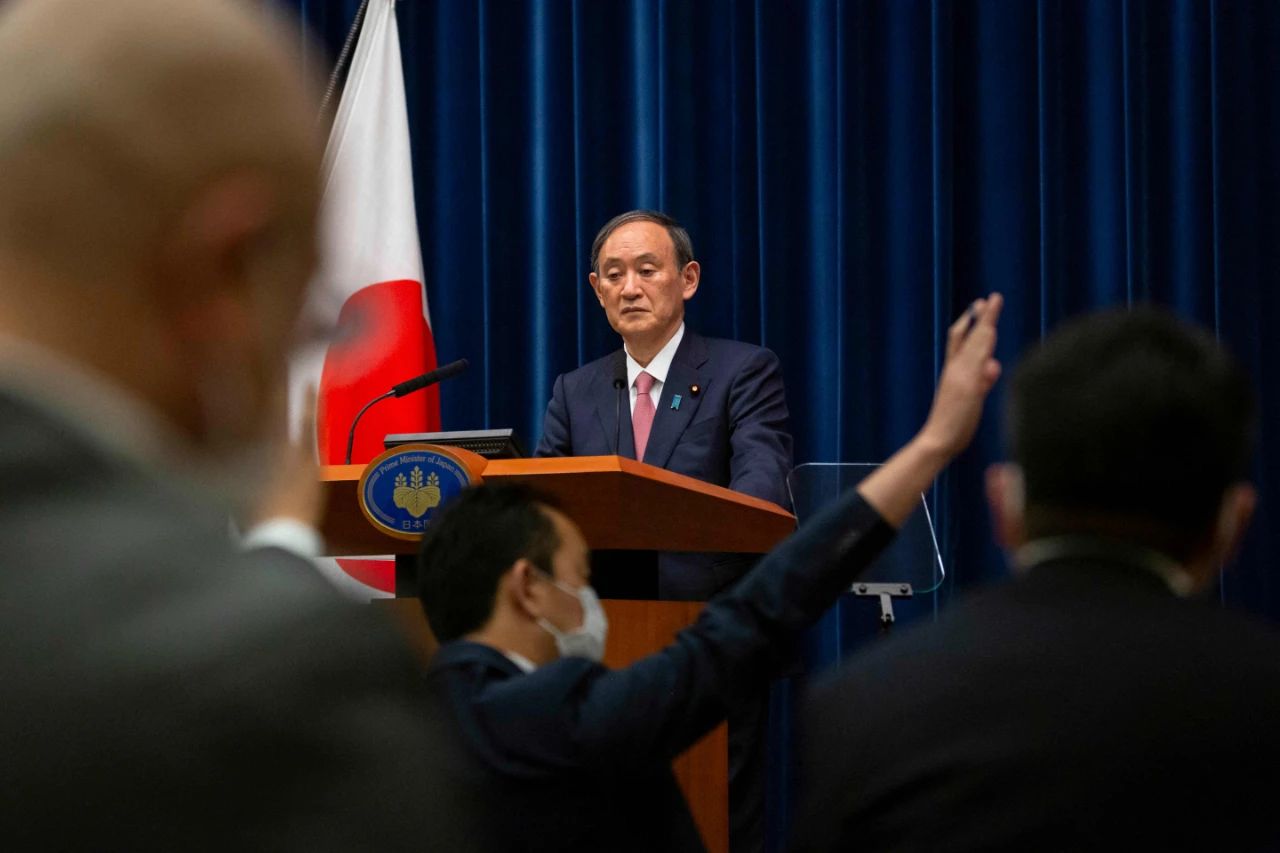 △5月14日,日本首相菅义伟出席新闻发布会。