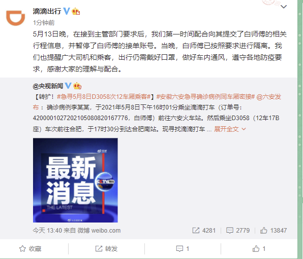 @滴滴出行 16日通报:“5月13日晚,在接到主管部门要求后,我们第一时间配合向其提交了白师傅的相关行程信息,并暂停了白师傅的接单账号。当晚,白师傅已按照要求进行隔离。我们也提醒广大司机和乘客,出行仍需戴好口罩,做好车内通风,遵守各地防疫要求,感谢大家的理解与配合。”