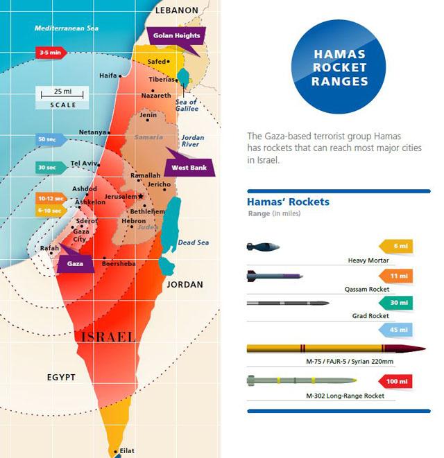 以色列国土面积狭小,200多公里射程的火箭弹如果从加沙发射,足以覆盖以色列全境。冲突发生后,以色列决定将国际航班降落地点从特拉维夫附近的本·古里安国际机场改降南部的拉蒙机场。然而,这一决定刚刚宣布,哈马斯就向拉蒙机场一带发射了一枚重达250公斤的重型远程火箭弹。