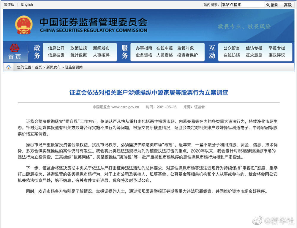 证监会依法对相关账户涉嫌操纵中源家居等股票行为立案调查