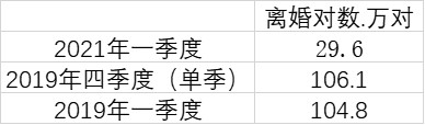 根据第一财经记者梳理,去年四季度单季度离婚登记人数是106.3万对,因此,从环比来看,今年一季度离婚登记人数下降了72.15%。同比来看,由于2020年一季度受疫情因素影响,数据不具有可比性,因此拿2019年一季度来做比较;2019年一季度离婚登记人数为104.8万对,今年一季度比两年前降幅达71.76%。