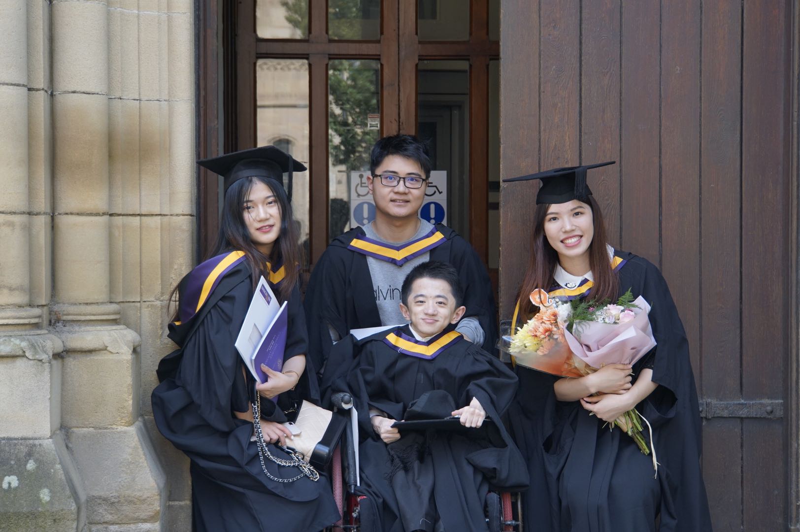 刘大铭(前中)在英国曼彻斯特大学毕业典礼上与同学们合影留念(2019年资料照片)。受访者供图