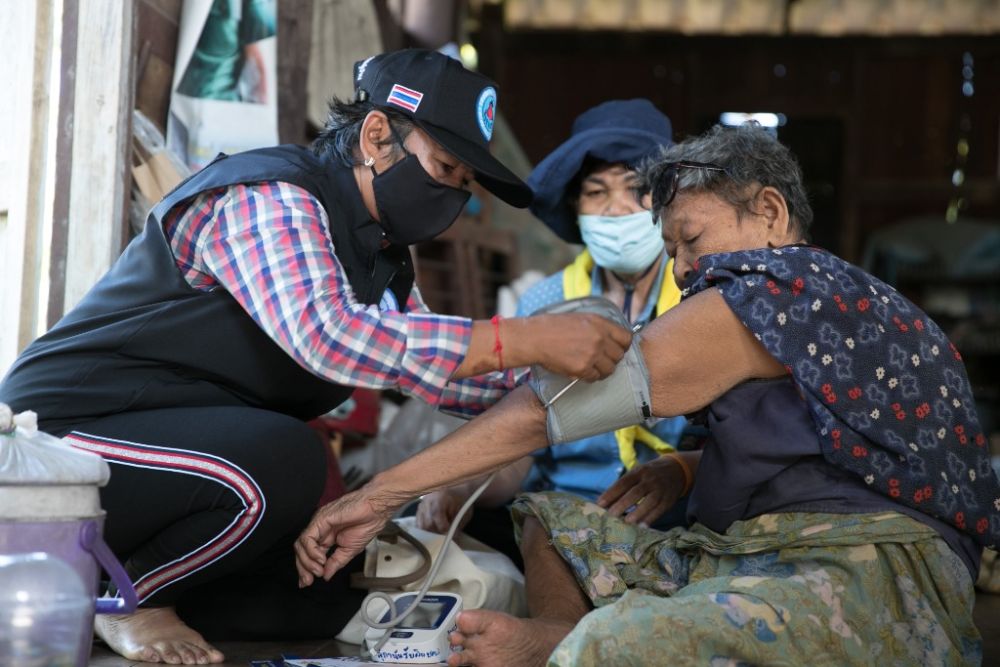 2020年6月24日,泰国西部叻武里府邦沛县的乡村医疗志愿者瑙瓦拉(左)为村民测量血压。(新华社记者张可任摄)
