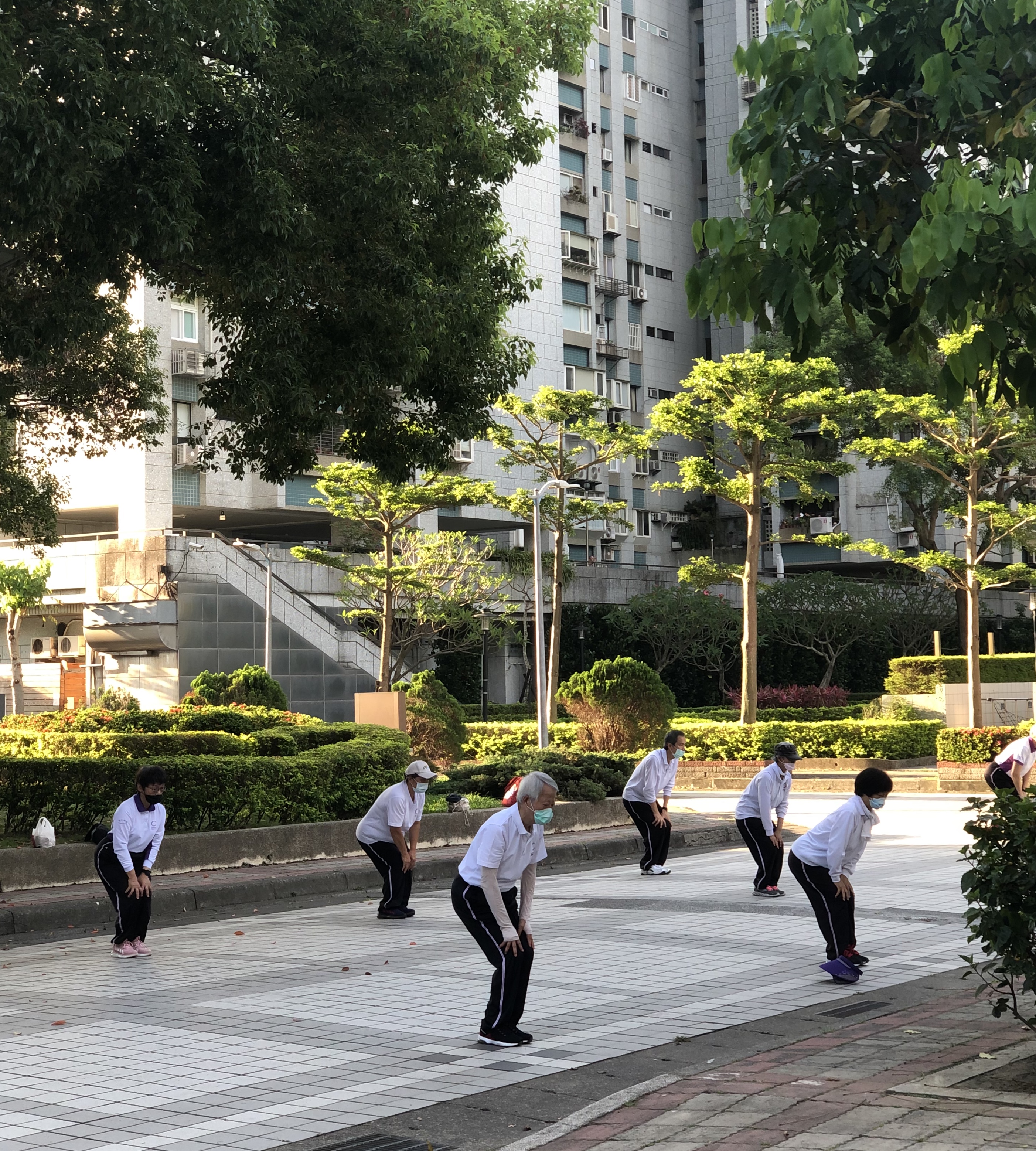 台北实施三级疫情警戒,出门须佩戴口罩。图为5月17日清晨,台北市松山区某社区内,几位老人戴着口罩在晨练。新华社记者 姜婷婷 摄