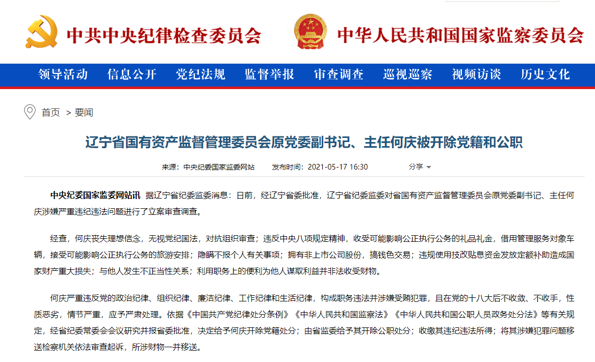 据辽宁省纪委监委消息:日前,经辽宁省委批准,辽宁省纪委监委对省国有资产监督管理委员会原党委副书记、主任何庆涉嫌严重违纪违法问题进行了立案审查调查。