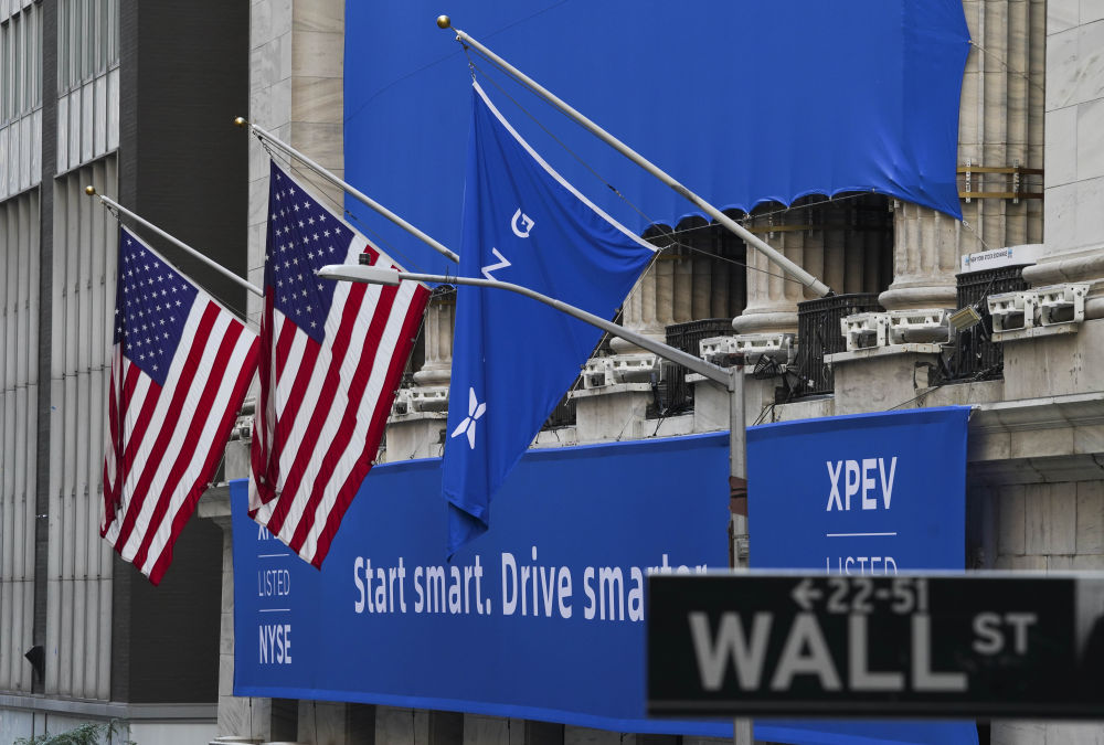 2020年8月27日在美国纽约证交所前拍摄的小鹏汽车标识。(新华社记者王迎摄)