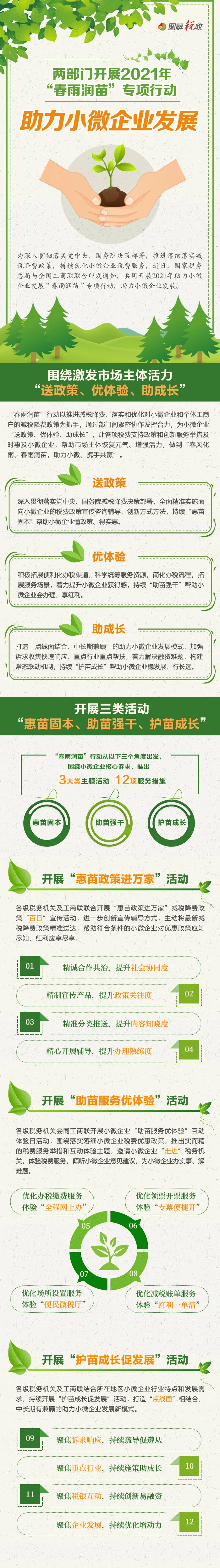 小微企业看过来!为推进落细落实减税降费政策,持续优化小微企业税费服务,近日国家税务总局与全国工商联共同开展2021年“春雨润苗”专项行动,推出12项行动措施,切实为纳税人缴费人办实事。戳图了解一下吧↓↓↓