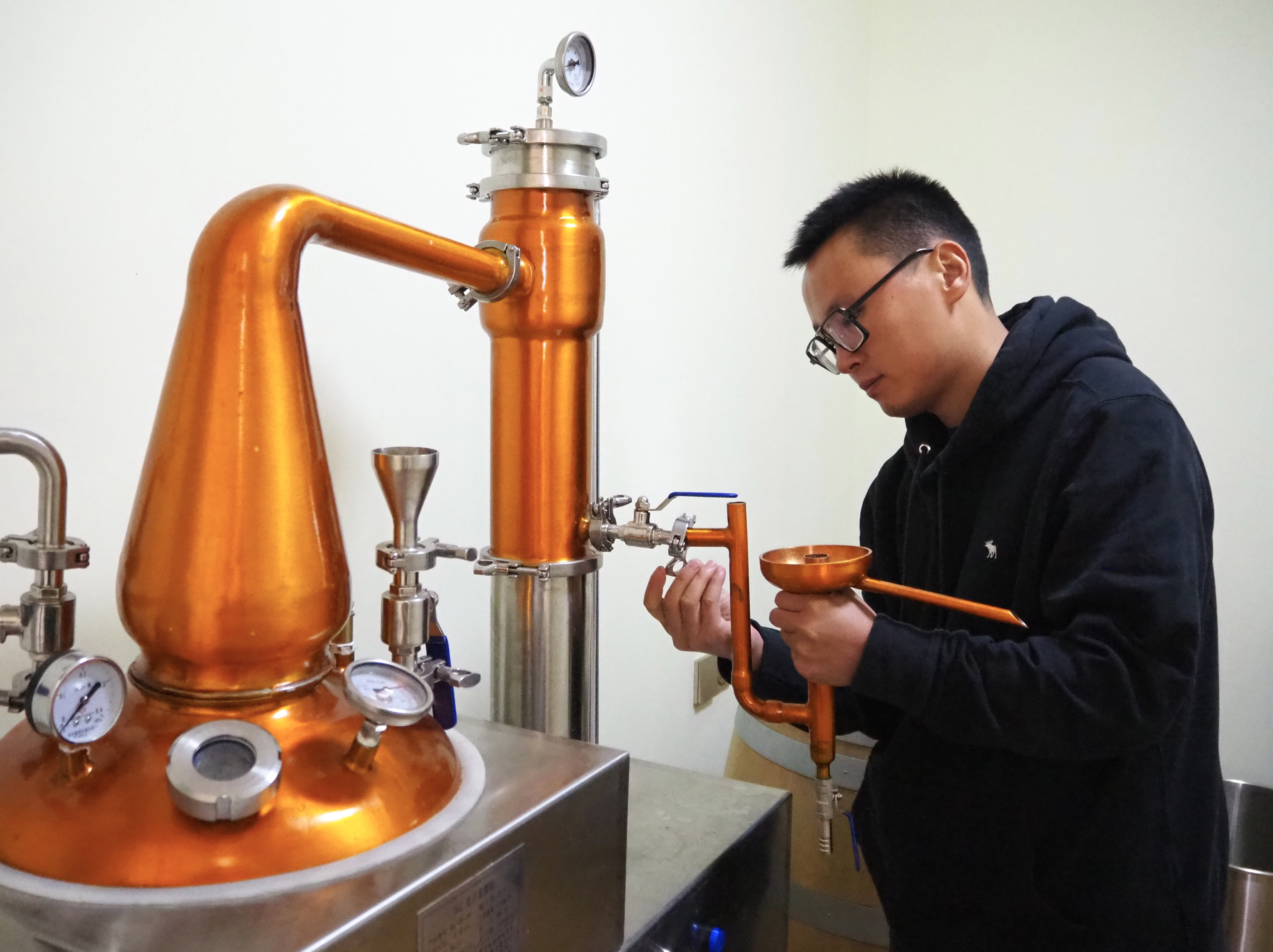 郭江正在调试酿酒的蒸馏设备。新华社记者 金一清 摄