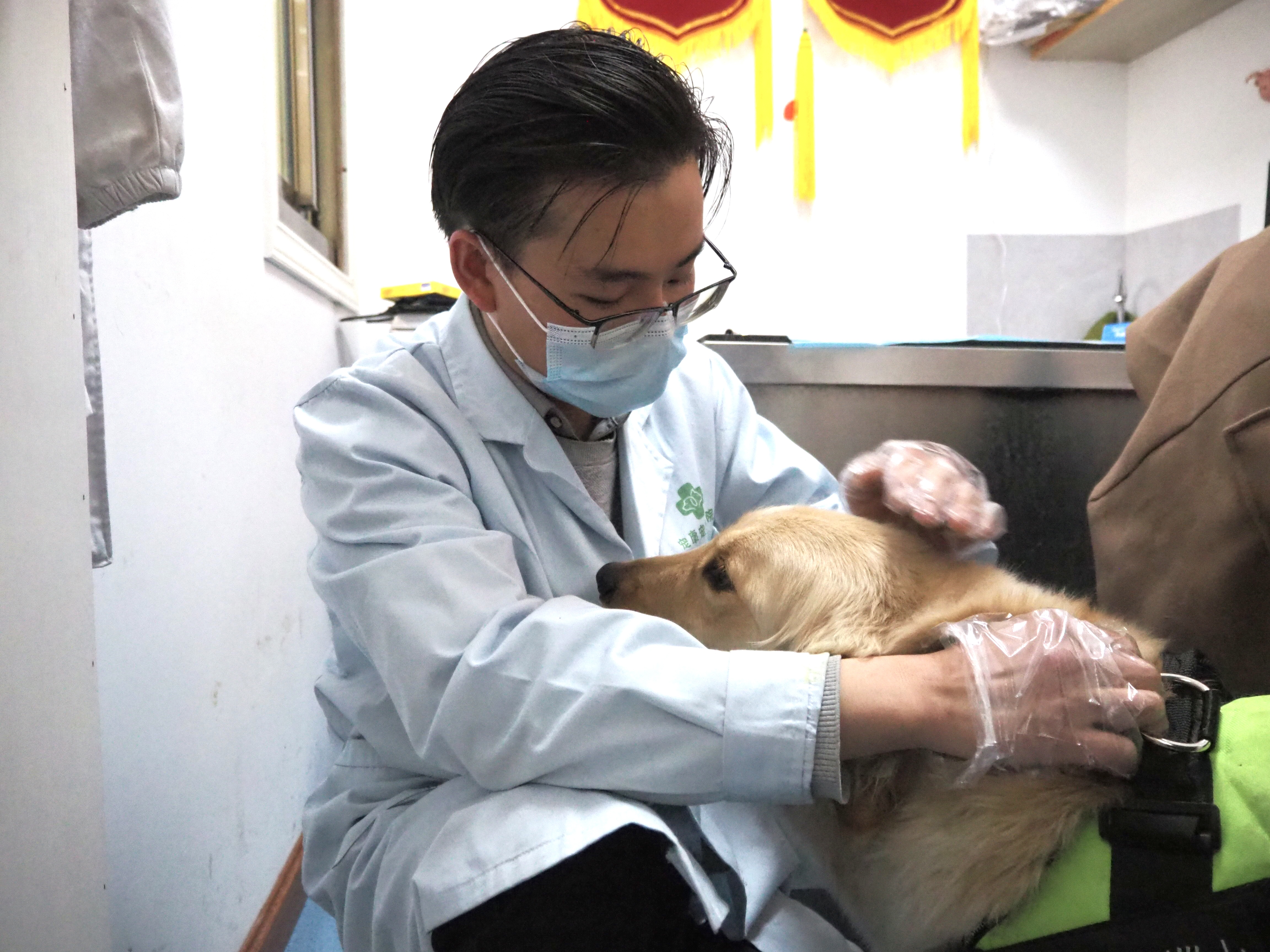 一家不到100平方米的店面,干净整洁,设备齐全,从体重秤到生化分析仪,应有尽有。薛祯宁抱着一只被鸡骨头卡了肠道的金毛犬,用听诊器做一些初步的检查。