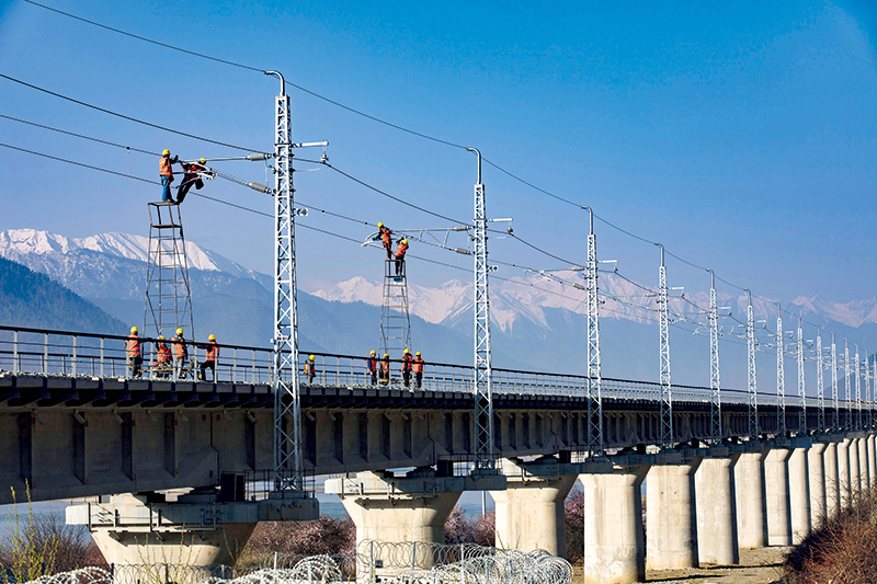 3月29日,中铁电气化局集团技术工人在拉林铁路进行接触网精调作业 焦宏涛摄/本刊