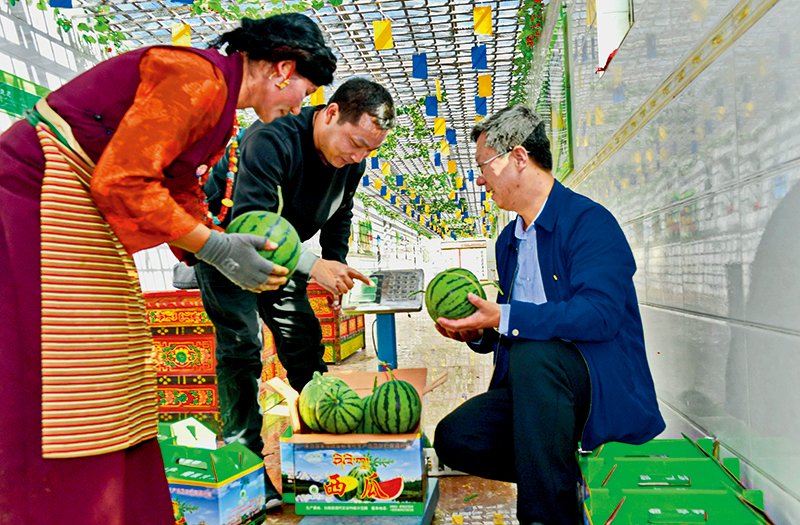 西藏白朗县农业科技示范园,山东济南援藏干部鞠正江(右)、程凤国(中)和园区工人一起将采摘的西瓜装箱(2019年5月29日摄) 张汝锋摄/本刊