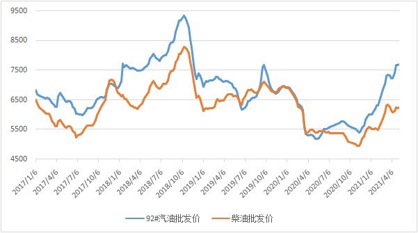 中国汽柴油批发价格周度均价走势表(单位:元/吨)