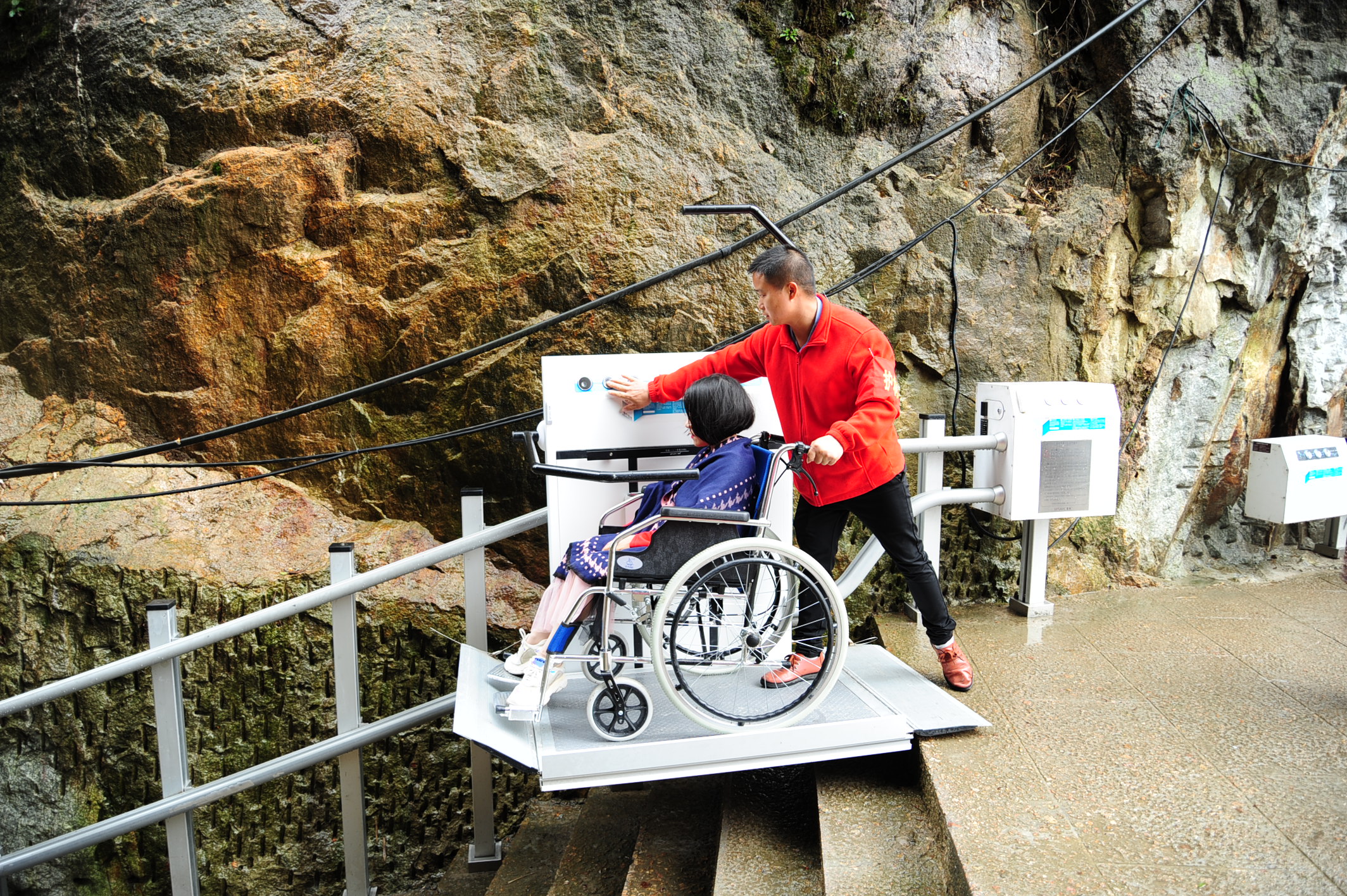 “轮椅游客”在工作人员陪护下乘坐提升机游览莽山五指峰景区。新华社记者 明星 摄