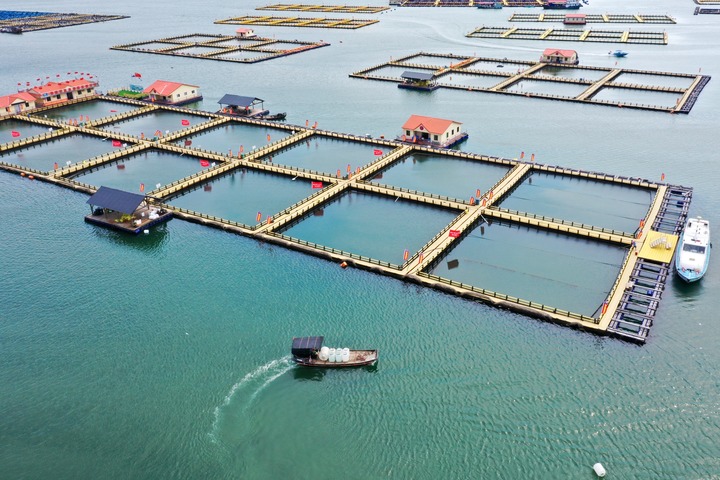 渔船驶过福建省宁德市三都澳大黄鱼深水塑胶渔排养殖区(无人机照片,2020年7月15日摄)。新华社记者姜克红摄