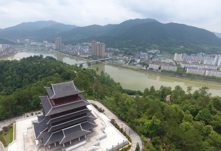南平市顺昌县金溪和富屯溪两溪交汇的观静山上的顺昌阁和顺昌县城一角(无人机照片)。新华社记者林善传摄