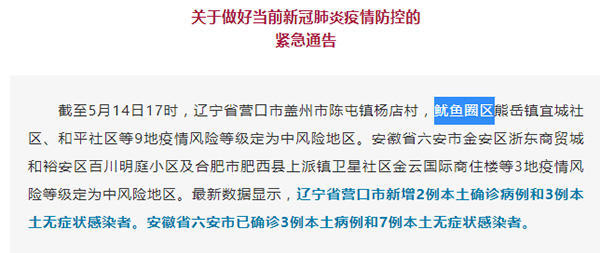 上述落款为“XX县应对新型冠状病毒感染肺炎疫情防控指挥部办公室”的通告原本写道,“截至5月14日17时,辽宁省营口市盖州市陈屯镇杨店村,鱿鱼圈区熊岳镇宜城社区、和平社区等9地疫情风险等级定为中风险地区。”