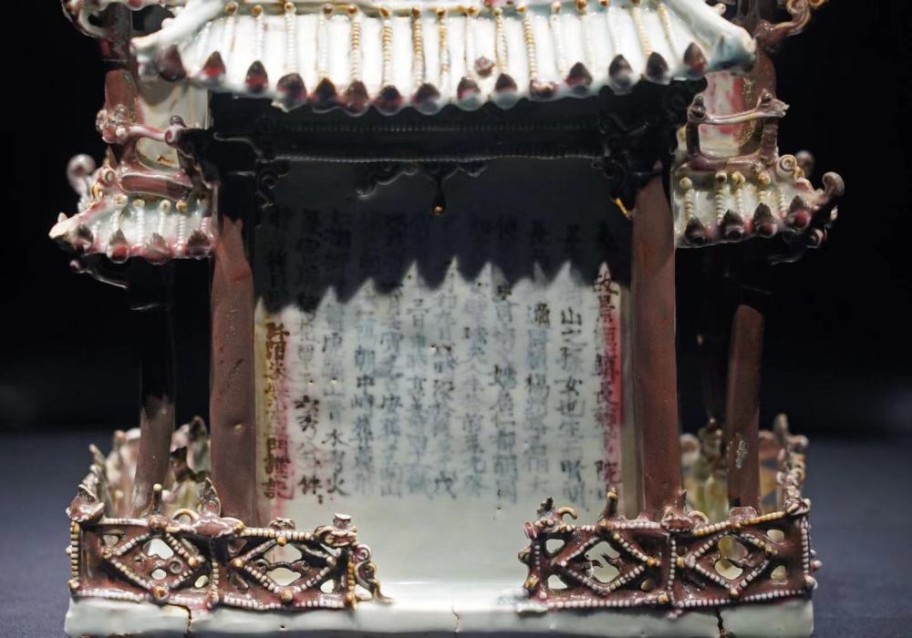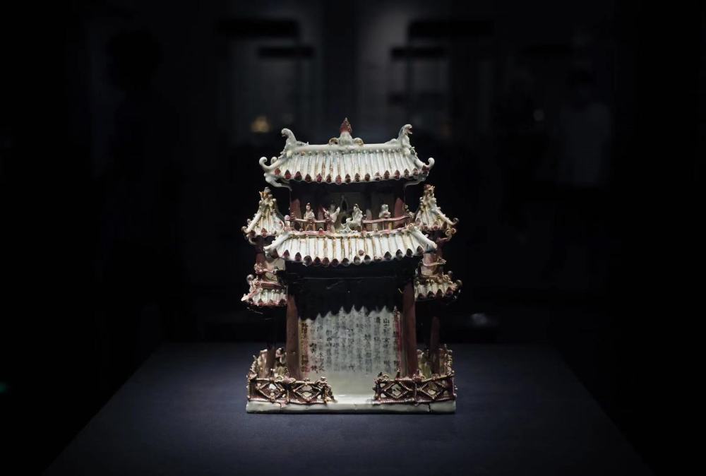 这件楼阁式谷仓是元代景德镇瓷业成就的集大成者。这件器物集四种最重要的高温釉彩——青白釉、红釉、青花、釉里红于一器,制作难度大,极为罕见。