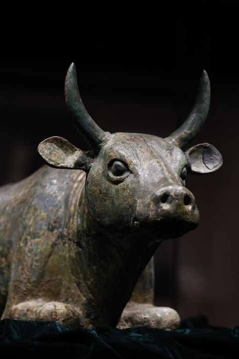 鎏金铜牛1977年出土于西夏陵第101号陪葬墓。整尊铜牛是由青铜浇铸而成,内部空心,外表鎏金,代表了西夏时期最为高超的青铜铸造工艺,真正达到了以形传神、神形兼备的最高境界。