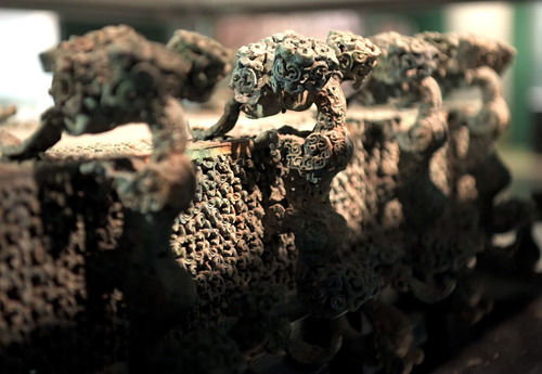 云纹铜禁于1978年淅川下寺楚墓出土。西周时期,颁布了中国历史上第一部禁酒令,并将盛放酒器的案子称为禁。云纹铜禁上端装饰有12个龙形兽,下端为12个虎形兽,采用失蜡法铸造而成。
