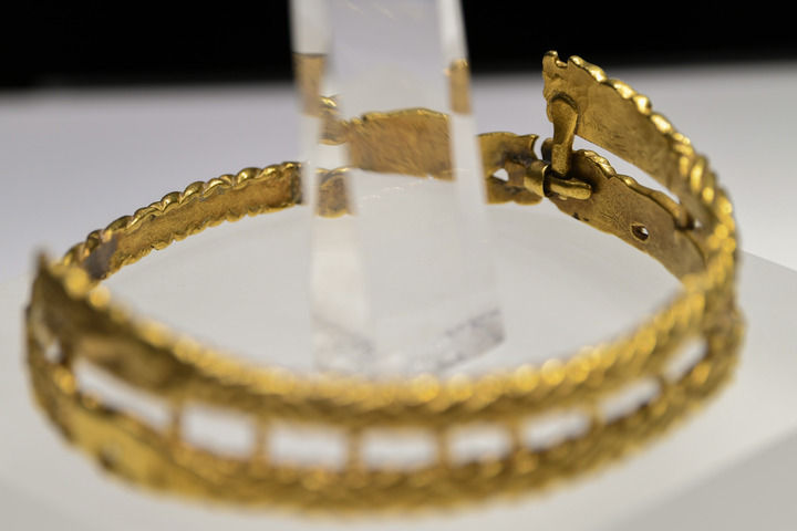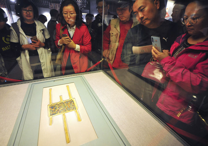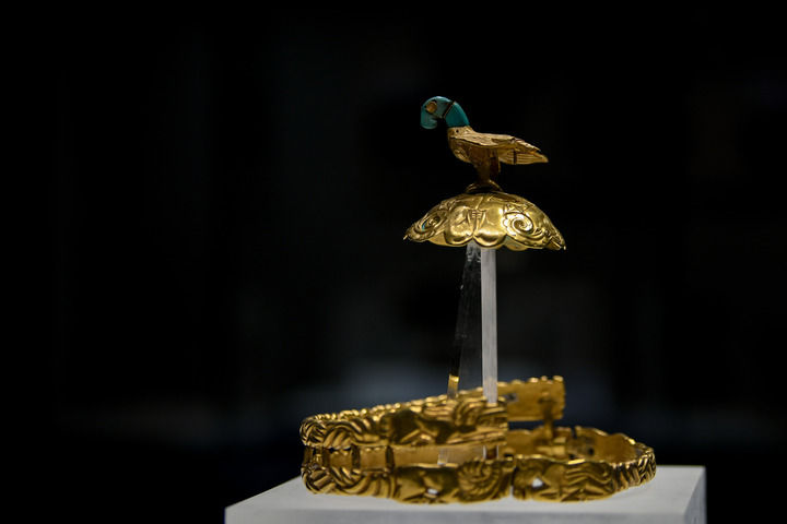 鹰顶金冠饰是上世纪七十年代,在内蒙古鄂尔多斯市杭锦旗阿鲁柴登地区发掘出土。根据专家学者研究认为,鹰顶金冠有可能是当时部族领袖所佩戴的一件王冠。