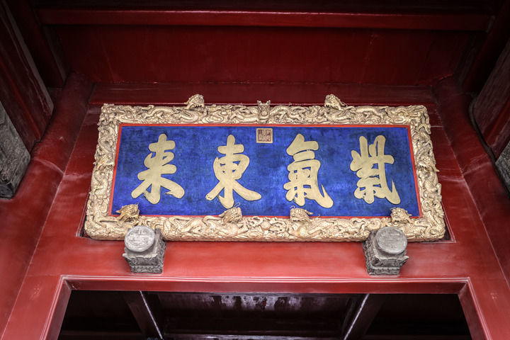 清金漆九龙紫气东来匾由清宫内务府制造,匾为木雕髹漆、镶铜字制成,匾外框浮雕云龙图案,九龙之首采用圆雕工艺,生动灵活;匾面刷洋蓝,其上镶铜板制成的大字“紫气东来”,文字中央上部镶朱文篆书“乾隆御笔之宝”印玺。