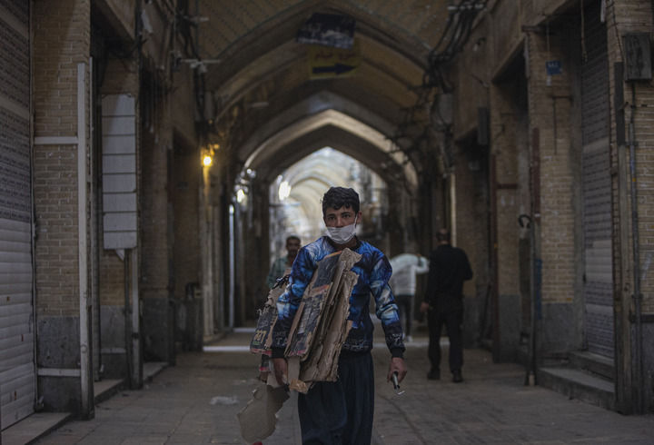 4月10日,在伊朗首都德黑兰大巴扎,行人走过关闭的商店。(新华社发,艾哈迈德·哈拉比萨斯摄)
