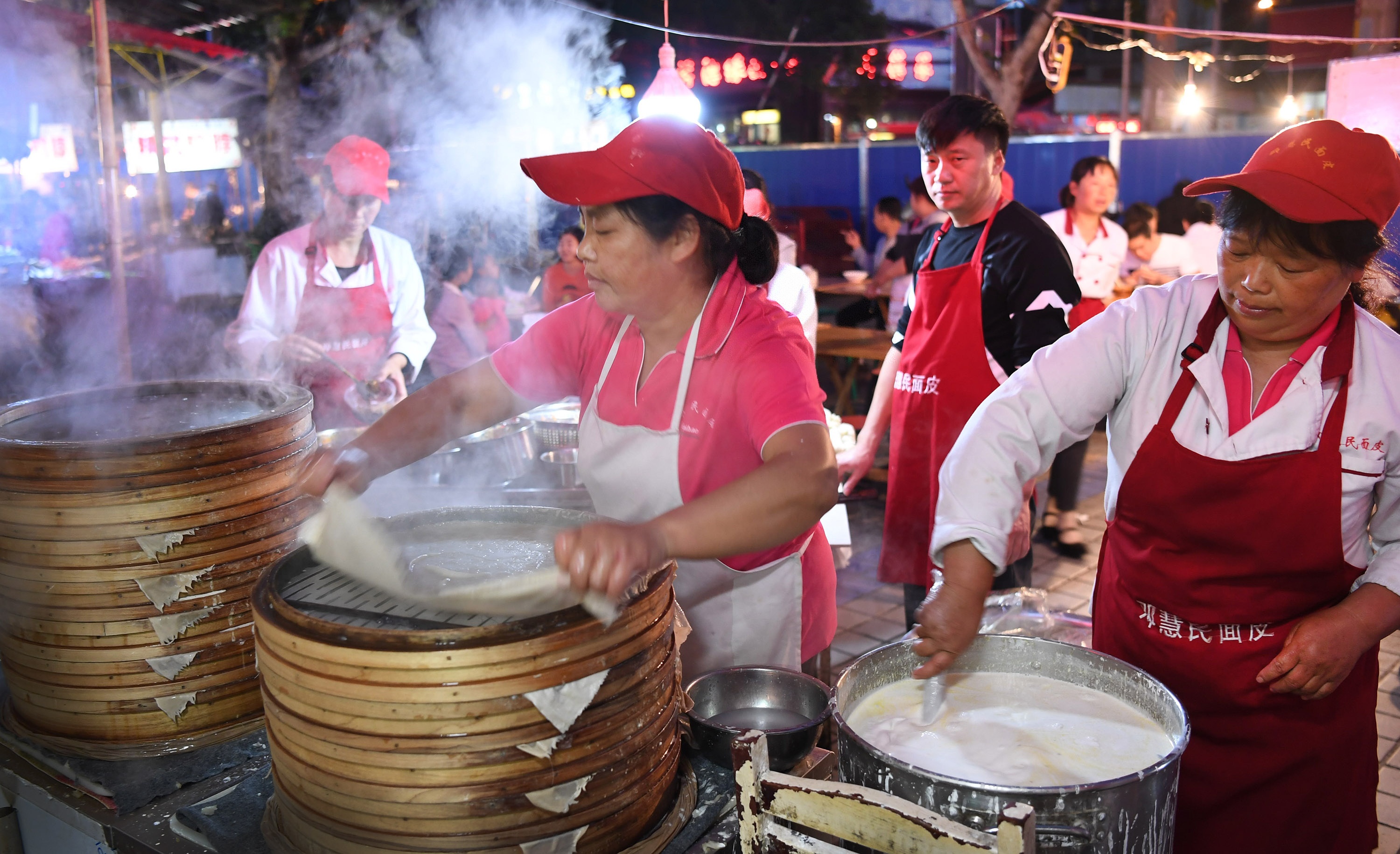 在陕西省汉中市前进路夜市,一家面皮店的师傅在蒸制热面皮。汉中面皮是陕西省的著名小吃,入选“中国十大经典地方早餐”。新华社记者 陶明 摄(资料照片)